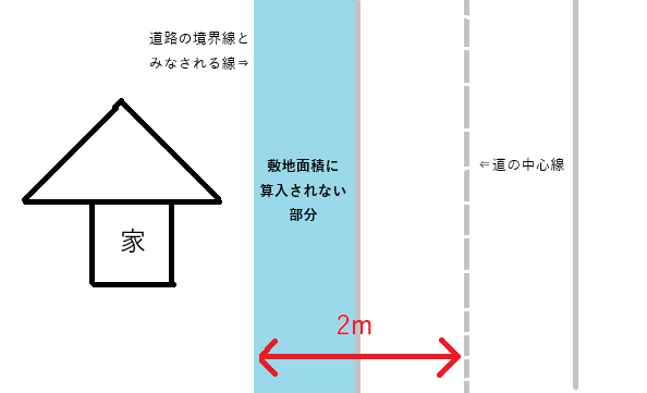 建築基準法第42条第2項の規定により道路の境界線とみなされる線と道との間の部分の敷地が私有地である場合は、敷地面積に算入される。